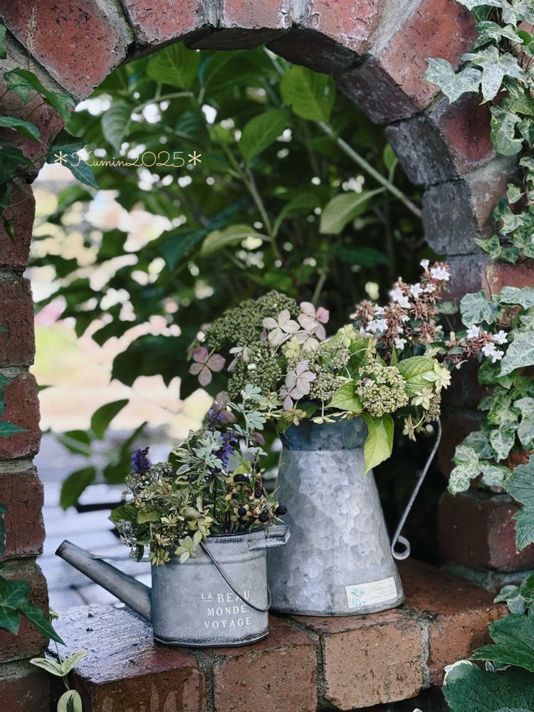 わあ〜お庭の季節のお花をたくさん摘まれて可愛いジョウロに🌿🍀🌿💕