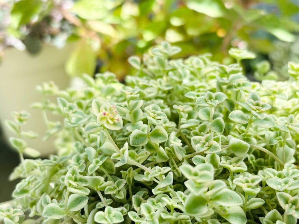 小さな葉っぱで肉厚な葉がモサモサꕀෆ¨っと茂って葉のフチが薄くピンクなところが可愛らしい✨ᖙ*˘ᵕ˘*ᖚ✨