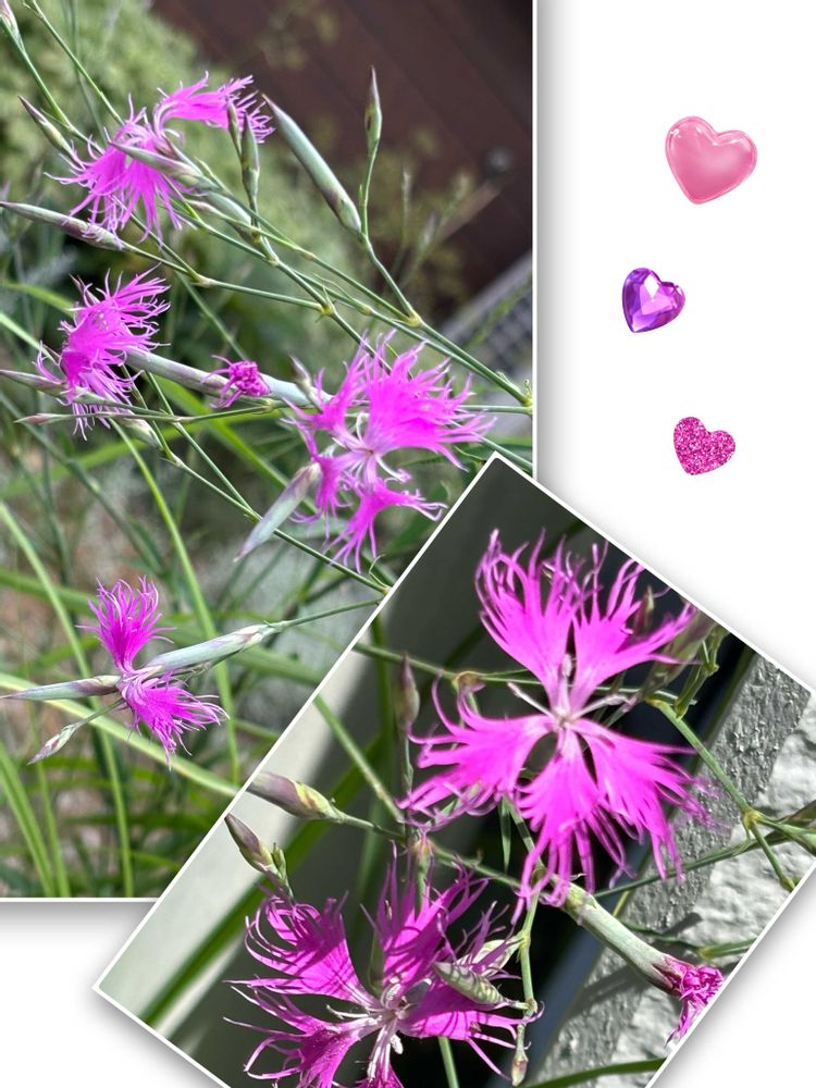 ①カワラナデシコ。昨年線路際の、小川脇にあっとを摘んで花瓶に咲いていたら、根が、。ジャリの所に植えてみたらお花が咲いた💗可愛らしいなぁ💘
