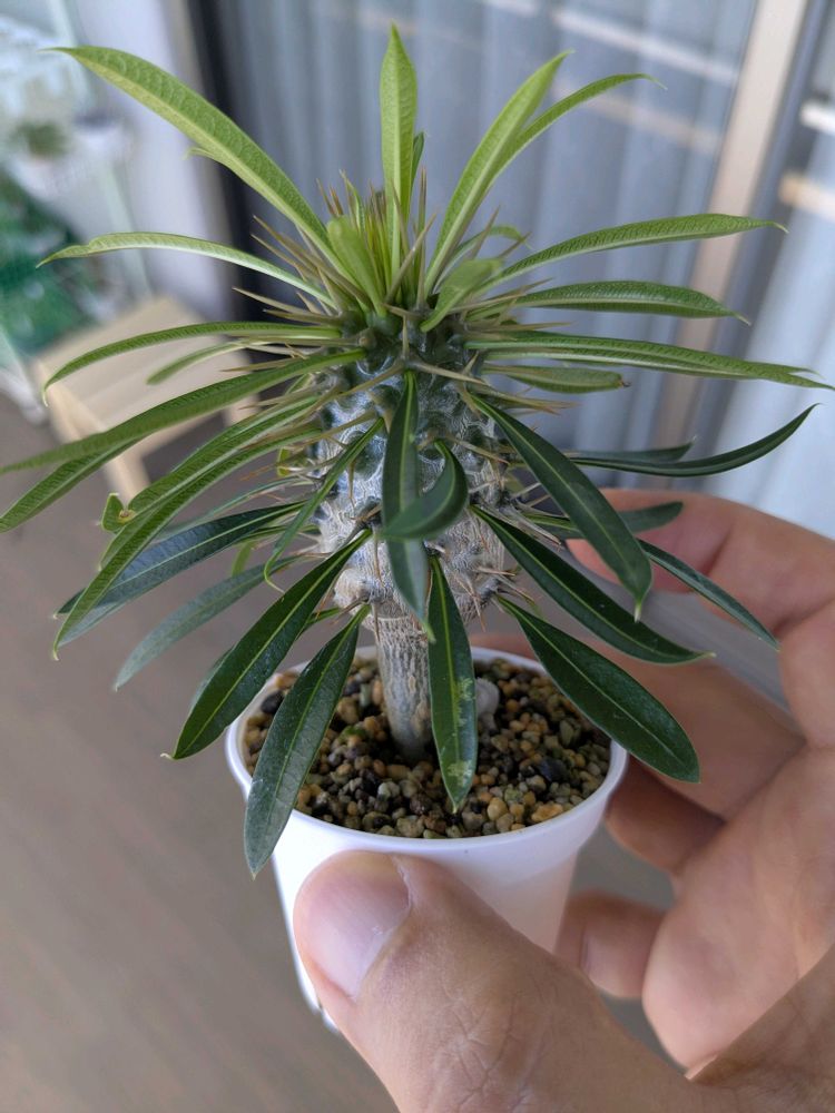 ④パキポディウム・ラメリーさん。雨晒しにしてから絶好調😝もう、パッツンパッツンで、今年生えてきた緑のところもあっという間に木質化👀