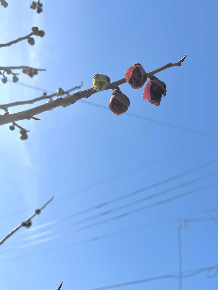 この時期に、、大体は4月の初旬に普通は上から下に垂れ下がる様に咲きます。(写真は追加しておきますが、こんな花です。)