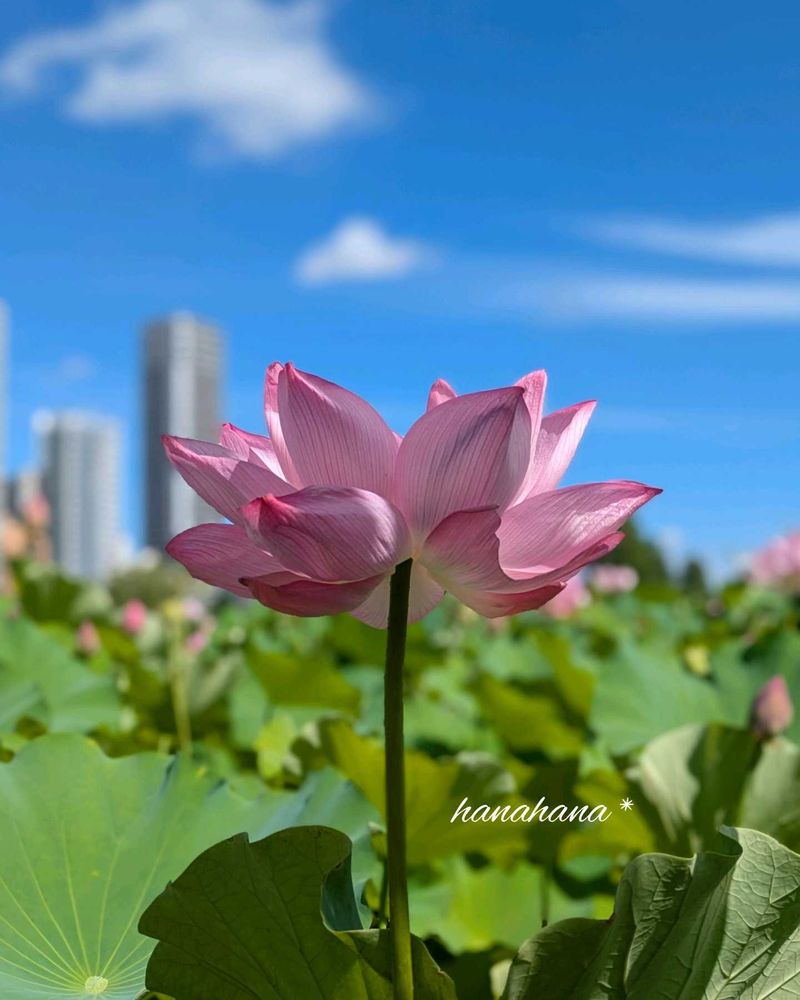 ビルを背景に咲くハスの花たち🪷🪷🪷