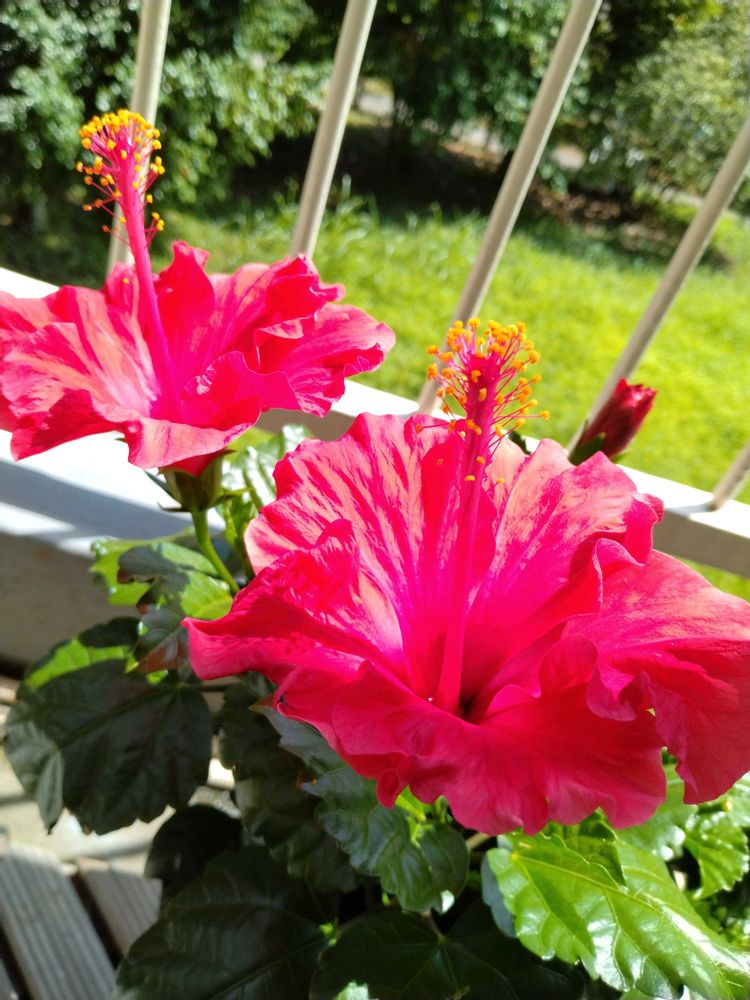 太陽の光が強過ぎて赤がピンク🌺に見えますが真っ赤なハイビスカス🌺です。
