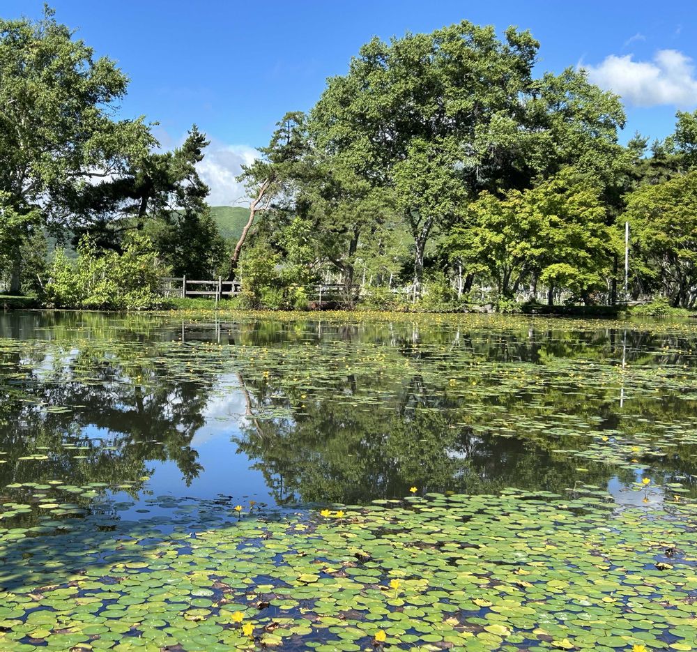 白樺湖のお隣にある、ミニレマン湖です。湖面に咲いている黄色い花は、アサザという水草だそう。