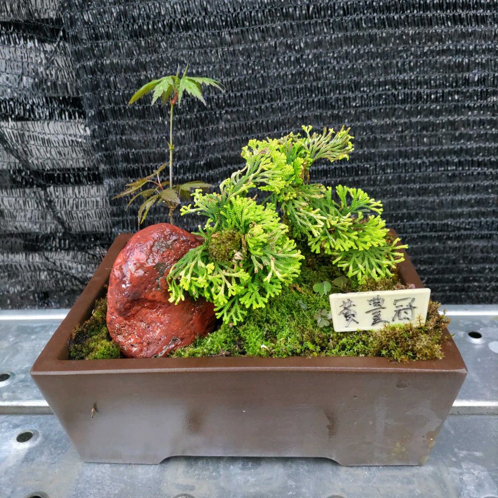 〈地道投稿〉まだ30度超えてます。1️⃣「岩ヒバ 黄豊冠」に根は生きてたが🤔根と幹だけの「モミジ」付け足し2週間、新葉🌱出てきたからGSに投稿、その前に目立つ赤石に交換しました。2️⃣昼から、我が家で一番大きい「岩ヒバ(山採り?我もハゲきみ)」に、こちらも小鉢「モミジ」付け足しました。