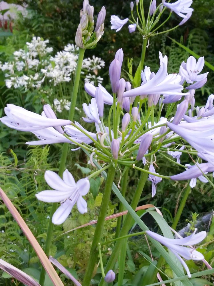 ①② 薄紫のアガパンサスと奥には鉢植えの白いアガパンサス✨