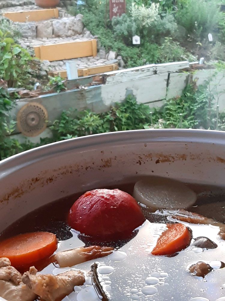 シャワーでスッキリ 涼しいお部屋での 熱々おでん🍢 いいですね〜。🍅が 気になります。