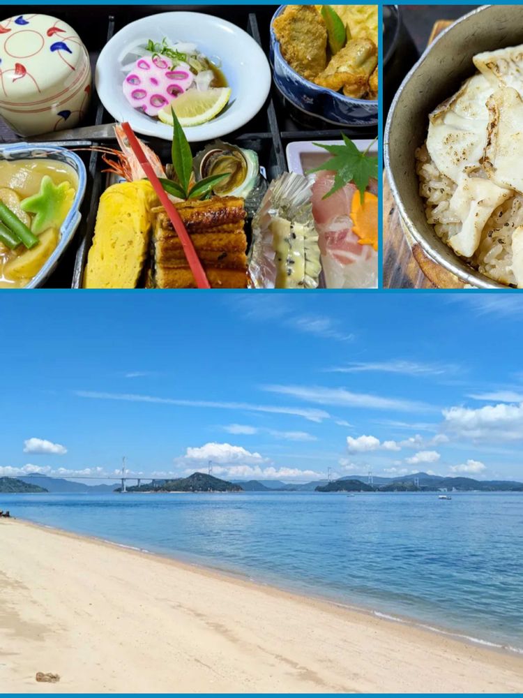 ②若者は元気なこと!今日長女一家は、愛媛県今治市で海を見て昼食を楽しんで来たそうです。(写真が送られてきました。遠くに見える橋はしまなみ海道🛣️だと思います。ご存知の方も多いと思いますが、海の上を自動車専用道路が走っていて、自転車や原付・小型バイクが走れる側道あり。😃)