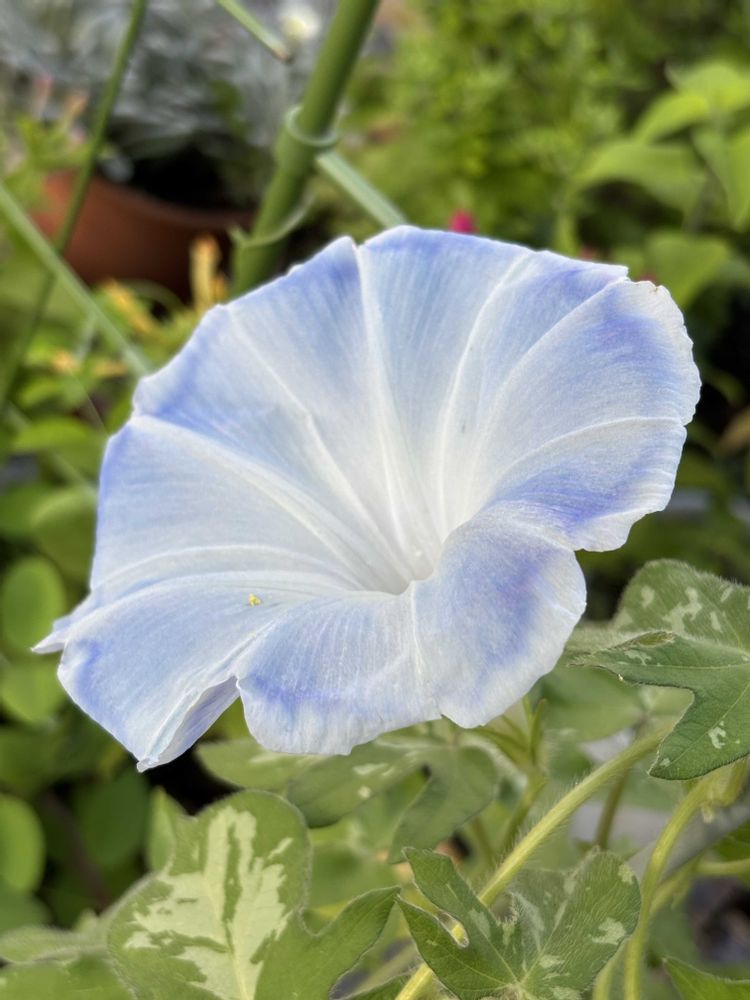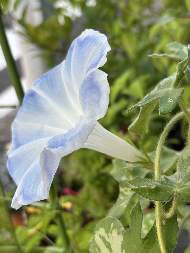 さて、やっと咲きました。我が家のアサガオ。名前は忘れちゃいましたが、うすい水色に白のラインが涼しげな大輪です🩵🤍