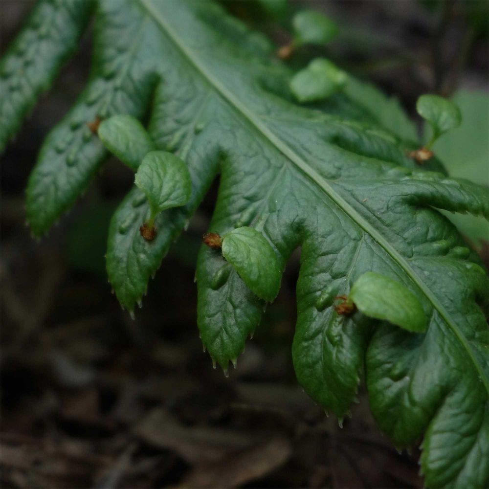 シダと言えば胞子、と単純な発想しか浮かばないのですが、それではいかんと思いシダ園をじっくり観察してみることに。ほぼ緑色で覆われたシダ園の一角に、すこし変わった姿の植物を発見。葉の表面に小さな葉っぱが付いている、コモチシダという植物。あとで調べると、その小さな葉っぱはもともと芽で、やがて親元の葉から地面に落ちると、新しい個体として成長するのだとか。シダの繁殖方法と言えば胞子、だけではなかったのですね。