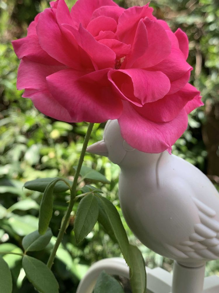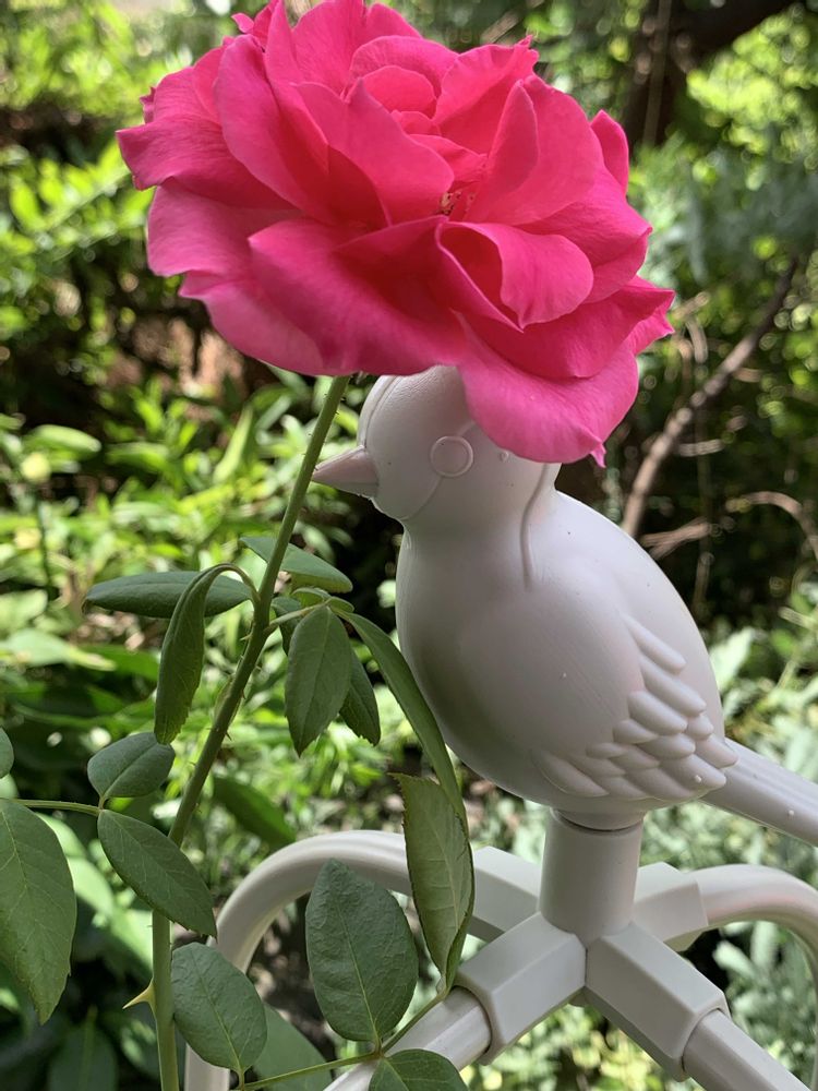 ピンク🩷の薔薇のパラソル、庭の小鳥さんがさしていました🩷今日も暑くなりそうですね🥵熱中症に注意です☀️