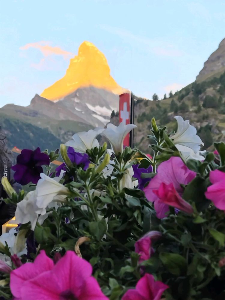 ④逆さマッターホルン ハイキングの途中で見られる素敵な光景💕こんなにくっきり見えるのはとてもラッキーらしい。ツアー仲間皆で自分達の日頃の行いを褒める🤣⑤早起きして見に行った朝焼けマッターホルンはレストランの花鉢の後ろからパチリ👀📷️✨
