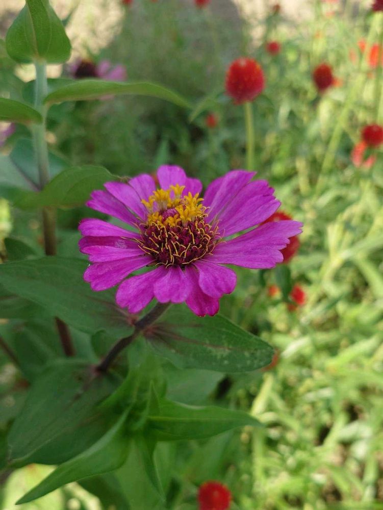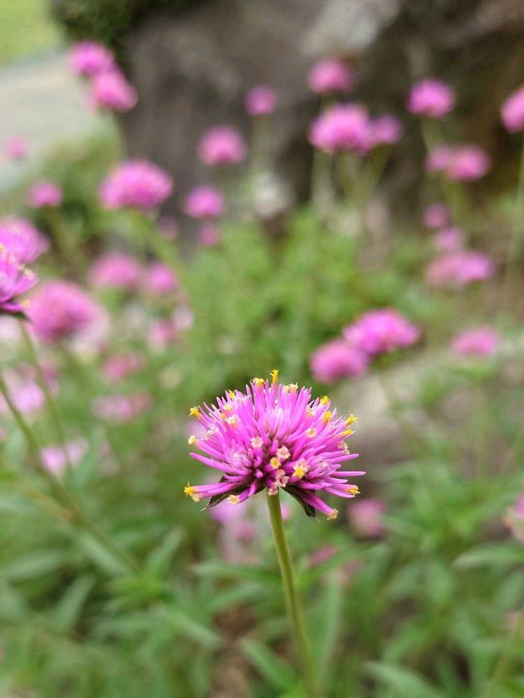 お隣で家庭菜園されてる方から頂いてこぼれ種で繋いでいます💮外庭(畑Garden)でセンニチコウ*ストロベリーフィールドと居る