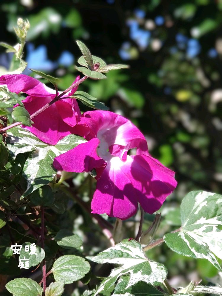 斑入りの葉っぱに鮮やかなピンクが夏空に映えます✨