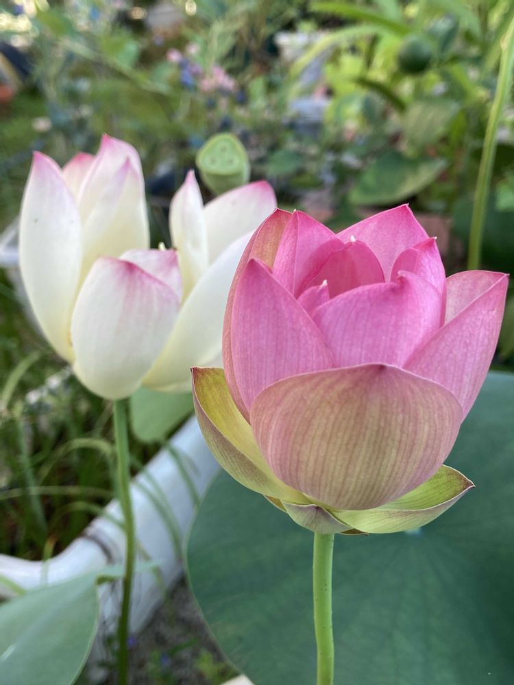 今日の蓮はちょうど散る前の子と新しく咲く前の子が紅白の蕾のようでした˖*♬೨̣̥