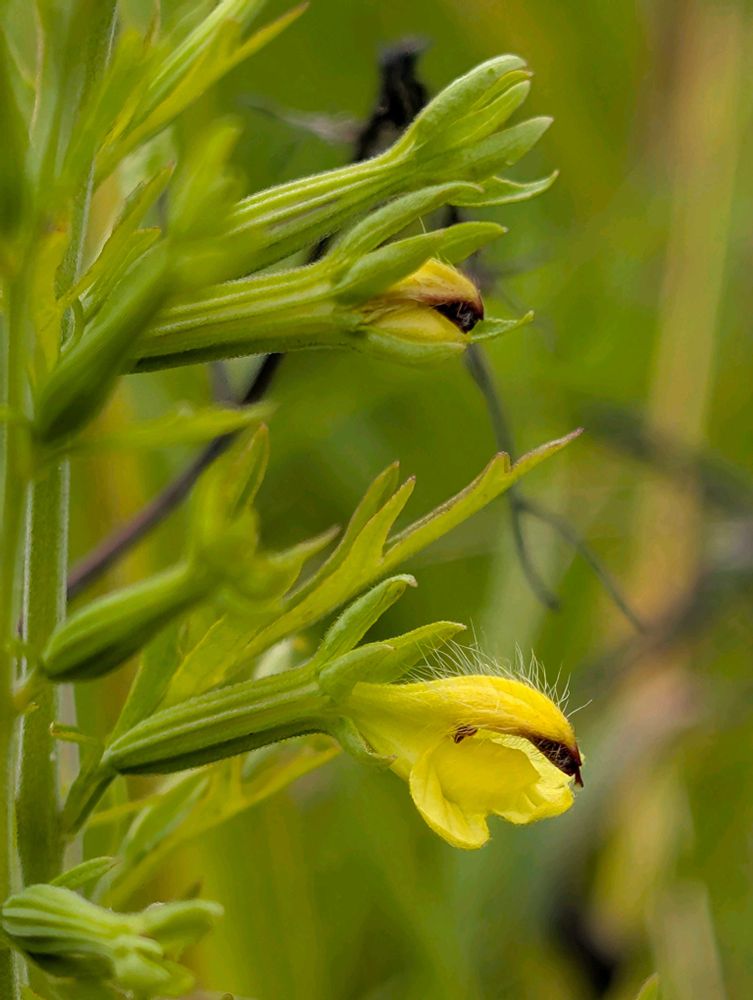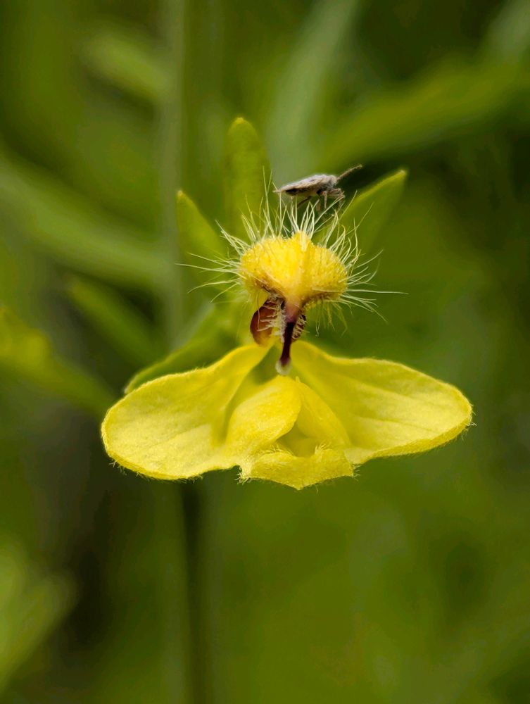花冠は黄色で唇形。上唇は先端が細くなり、外側に長い軟毛が生える。