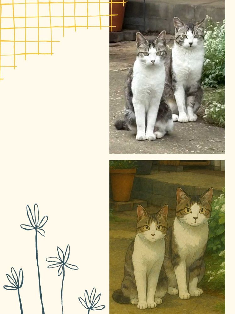 2️⃣3️⃣野良ニャンたちと、3週間前に里子に出た仔猫たち♡アプリでジブリ風に加工しました😊なかなか絵になると思いませんか?