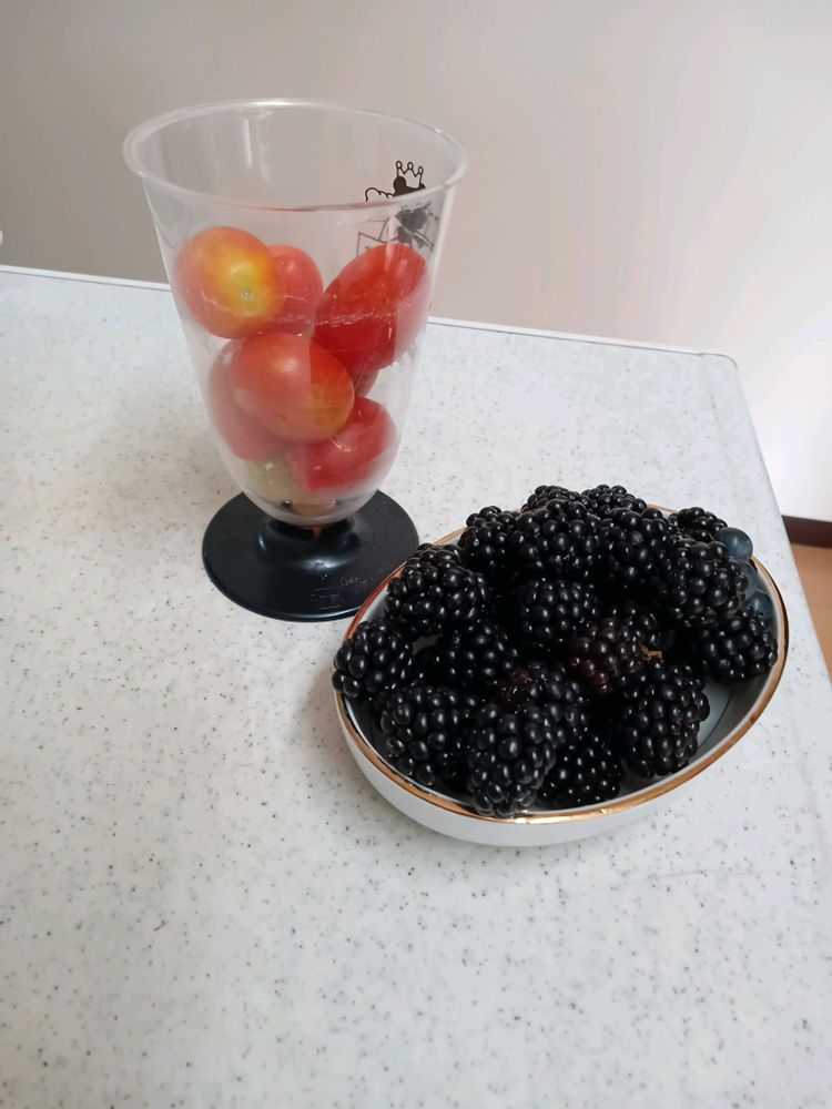 ①今朝の収穫、ミニトマトアイコ、ブラックベリー、ブルーベリー…貴重な収穫物です✨️💜🫐(*˘︶˘*).。*♡