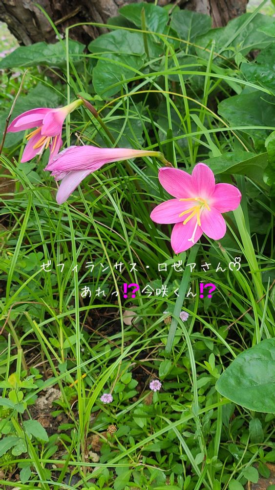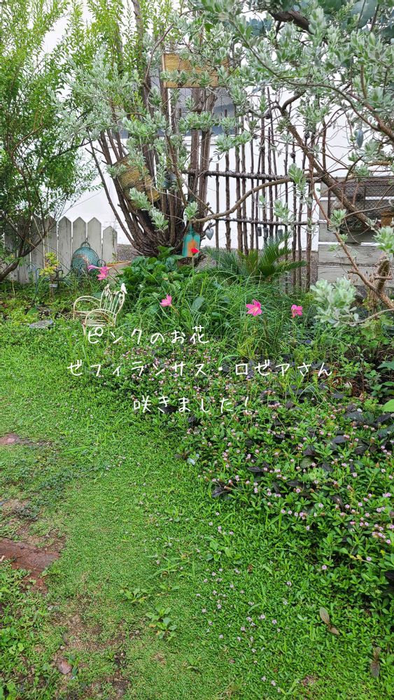 ユーカリの下ではピンクのお花のゼフィランサスさんの開花です!
