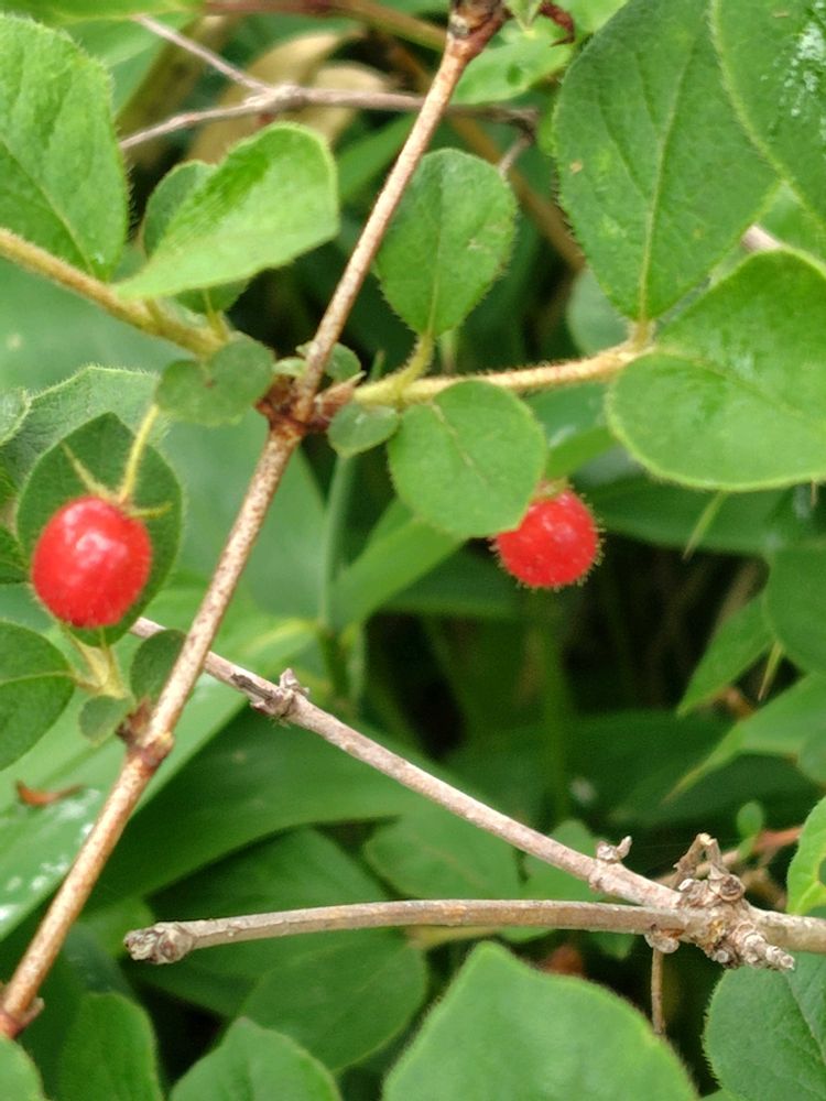 果実は直径6〜7mmで赤く熟し、先端に2個の花柱が残っている。