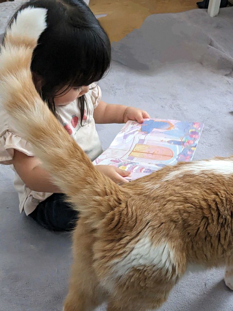 絵本を見ている孫の周りをスリスリと身体を寄せて…なが〜いシッポで頬や頭をペンペンと触っていました🤭構って欲しかったんでしょうか🤔😽