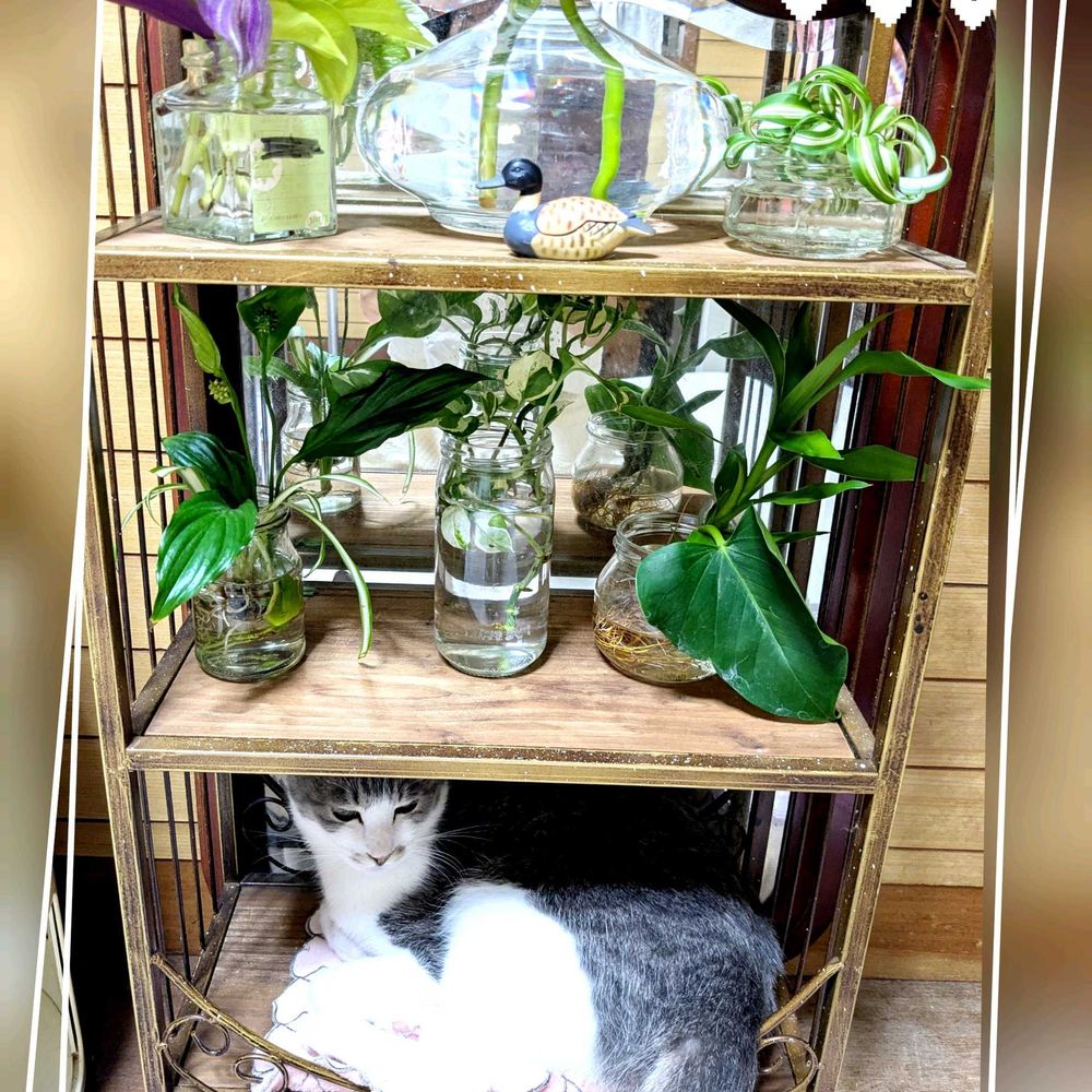 鈴ちゃんは最近は此処がお気に入りです 三段ベッド仕上げ?二階三階はガラス瓶の観葉植物の居場所です