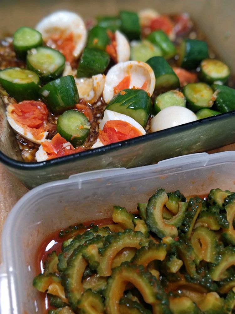 4枚め、常備菜🏷️。夏場は香味ダレに漬け込んだ野菜が美味しい😋。ゴーヤのキムチは夏の定番。サッと茹でてキムチの素に漬けてます。