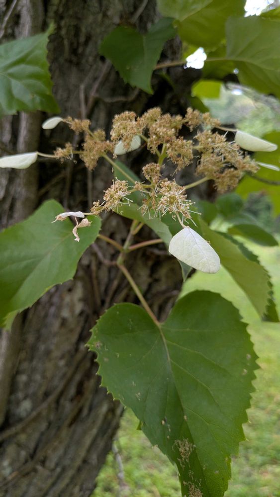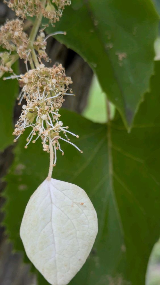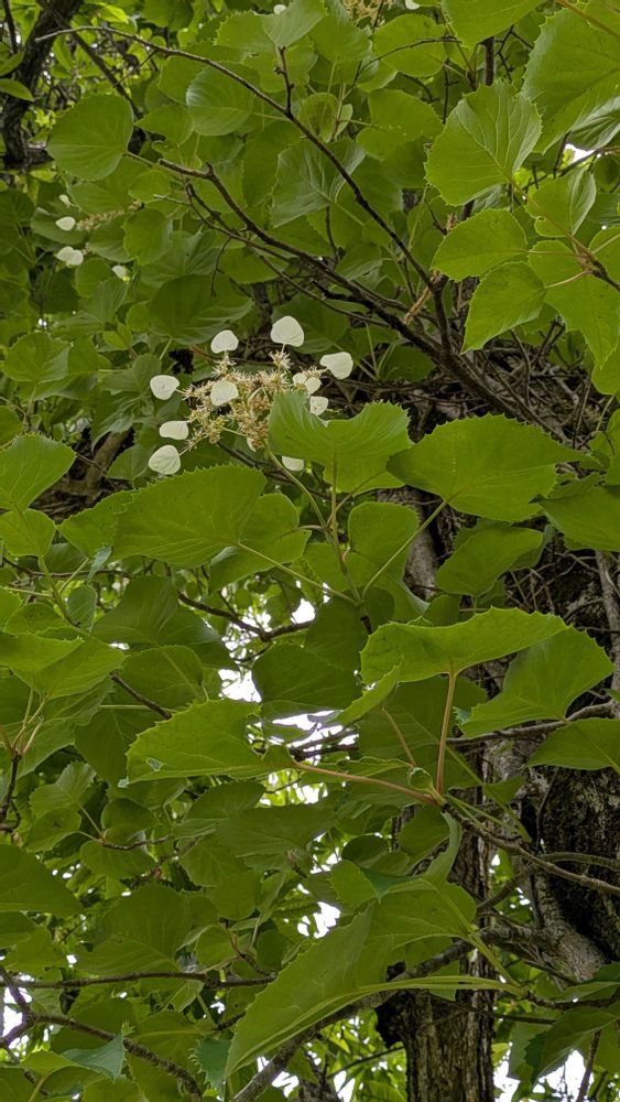 アジサイの装飾花は花弁でなく萼片と言われるが、イワガラミのそれは花弁というより1枚の白い葉が付いているようにも見える 白い水曜日♡🏷
