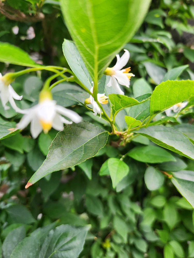 庭木の剪定をしていたら、季節外れのエゴノキの花が発見。