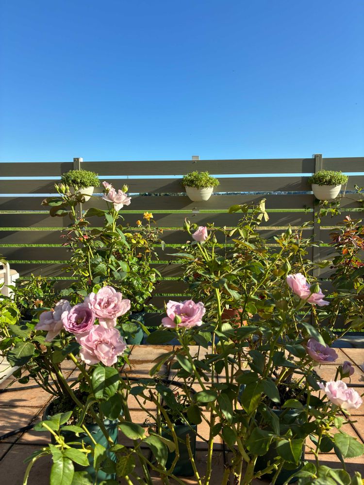 田園のひろびろとした所でのびのびと花咲く薔薇🌹達、気持ち良さそう🌿🟢🔵