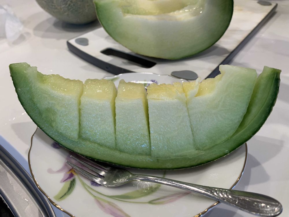 緑色メロン、完熟したかと思い食べてみましたが甘さはいまいちでした。