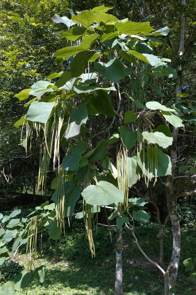 ノウゼンカズラ科キササゲ属の落葉高木。中国原産で江戸時代初期に渡来した。畑や庭に植えられ栽培される。民家の庭先に大木を見かけるのは、昔ながらの薬木であったことを伺わせる。地方の古い街の庭にこの木を植えている家は、ほとんどが昔は漢方医だったか漢方薬店だったのだという。また時に、川岸などで野生化したものが見かけられる。葉は桐に似た円形で秋に黄葉する。花期は6~7月、枝先の円錐花序に多数咲かせる。花は淡黄色、花弁の先が5裂した漏斗状で内側に濃紫色の斑紋があり、裂片の縁はちぢれている。果実は朔果。長さ30~40㎝のササゲに似た長い果実が枝から垂れ下がり晩秋に熟す。果実の中の扁平な種子は両端に長毛がついていて風にのって遠くまで飛ぶ。種子は荒廃した河川敷などで芽を出すとすぐ生長し育つと10mの高木になるが、高さ1m前後でもう花を咲かせて実を結び種子を作る。よく似たアメリカキササゲは北米原産で街路樹にされ、白い大きな花を咲かせる。