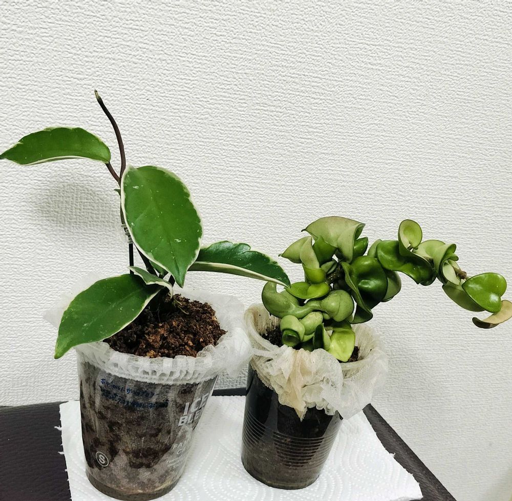 左側のホヤ・カルノーサ・リップカラーは2022/4〜大きくなって、株分けしたけど…ベランダに放置してほぼ枯らしてしまい、残り少しを水耕栽培で育てて一部がやっと大きくなってきたので、右側のホヤ・カルノーサ・コンパクタの植込み材と同じ様にして見ました😅