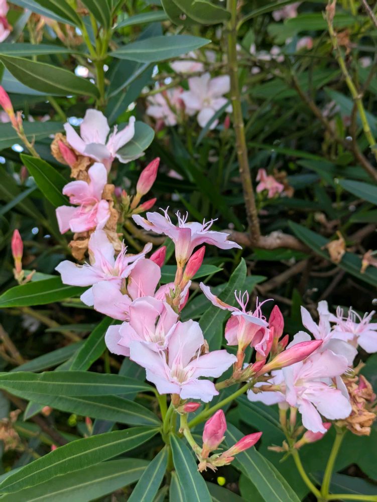 道路沿いの植え込みは 淡いピンク色🩷のキョウチクトウ