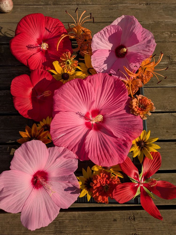 おっきなタイタンビカスが、咲いたので、どうやって表現すればいいかなと、水に浮かべる場所も無く、いつもの黒トレーに、逆さにして並べてみました。