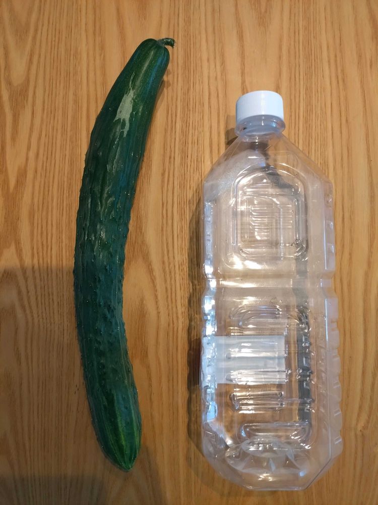 ①今年最長のキュウリ。2リットルペットボトルより長かった!今年は暑いからまだ大きいものも取れるかも。これは後ほど浅漬けとキムチ漬けにして美味しく頂きました。