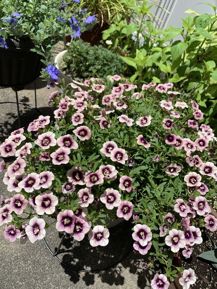 こんばんは🌃(๑˃̵ᴗ˂̵)ミリオンベルプチホイップラムレーズン💜🤍💜🤍なんか凄い増えましたね😳‼️😆👏💕マツバボタンも夏の陽射しが更に白がまぶしくてかわいいお花ですね🥰