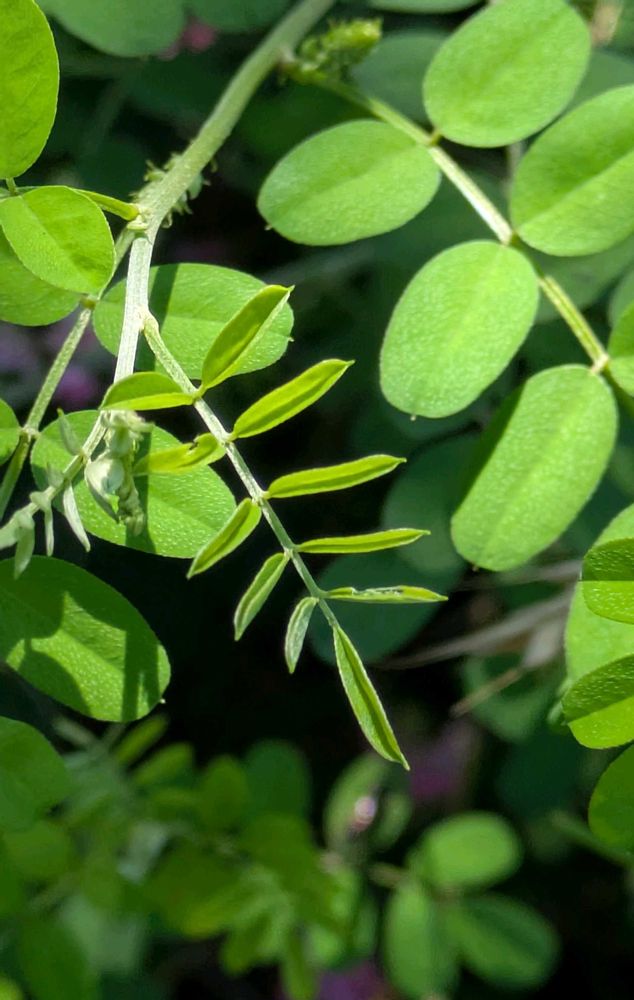 葉柄が短く、奇数羽状複葉の葉🟢小葉の先は円頭で小さな突起が見える💚