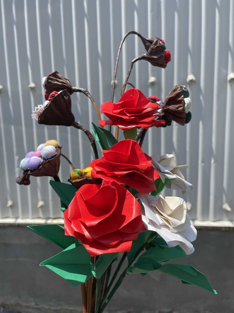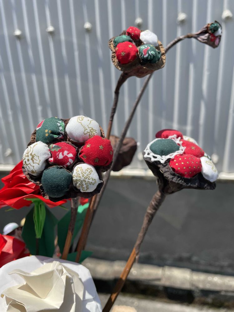 職場園芸していると前を通る花好きな方々が足を止めて観察をして行きます!お友達になったマダム達も沢山😆苗をあげたりして仲良くしていますが、今年はハスの株をあげた方からハスの花托を使った花束を頂きました💐😆お盆に飾ろうと思います😊