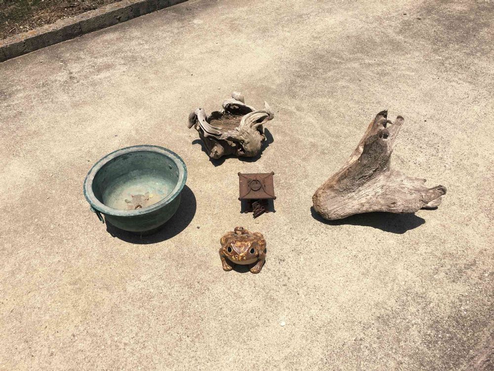 カエル、流木、流木鉢⁈、青銅色鉢 (穴開き)