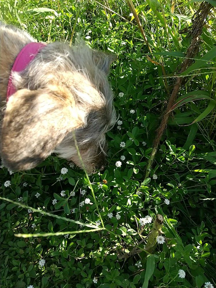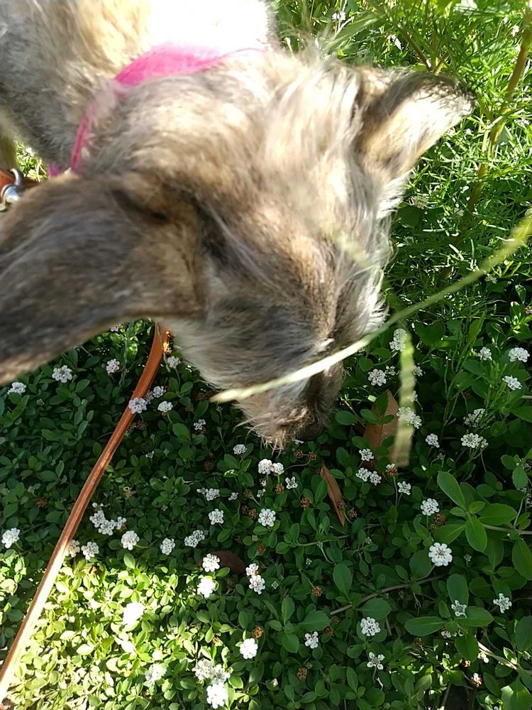 白い小花はヒメイワダレソウっていうんですね🤍😊可愛らしいお花🤍ティナちゃんと可愛いコラボ🐶💕