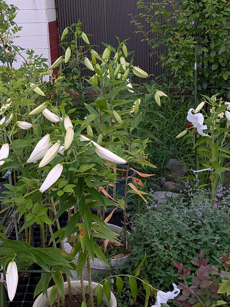 カサブランカが増えすぎて知人に嫁にだしたけどまだまだある鉢植え😅庭中百合の匂い…ニャンズと現場監督にはキツイだろう💦開花しはじめたから更に香りが強くなるはず…