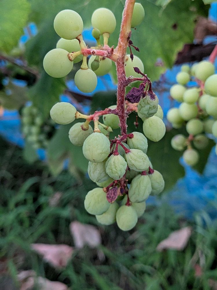 カラカラ過ぎて🍇のナイアガラが干しブドウみたいに💦巨峰は大丈夫そうだけどたさかこんなになってるとは😥雨除けのビニールで暑くなりすぎ灼けて枯れた葉が沢山💦暑い中1人でビニールをたくし上げ通気よくして、根っこがある場所に水まき、穴掘って浸透させ…明日また穴掘りして潅水、余力あれば雨除け取って斜頸、通気のために防風ネットに替えようか🤔
