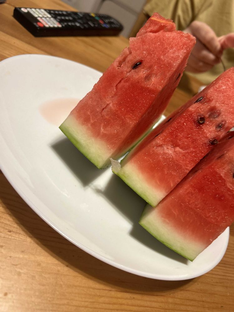 本物来たる😁BOSSのお姉さんから、お中元で来たスイカのお裾分け🍉初物じゃ😁関東…ンー😑下町じゃぁ、初物食うと寿命が三年伸びるって云うんだぜ。志村けんじゃないけど、初物ばっか食ってたら「まだまだ死なねぇぜ」って160くらいまで生きるわ😁