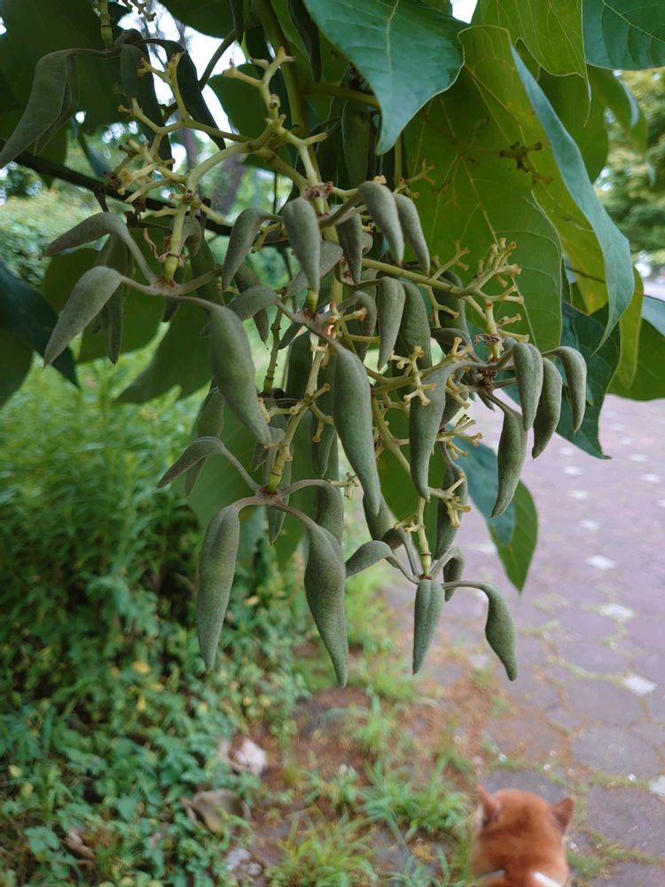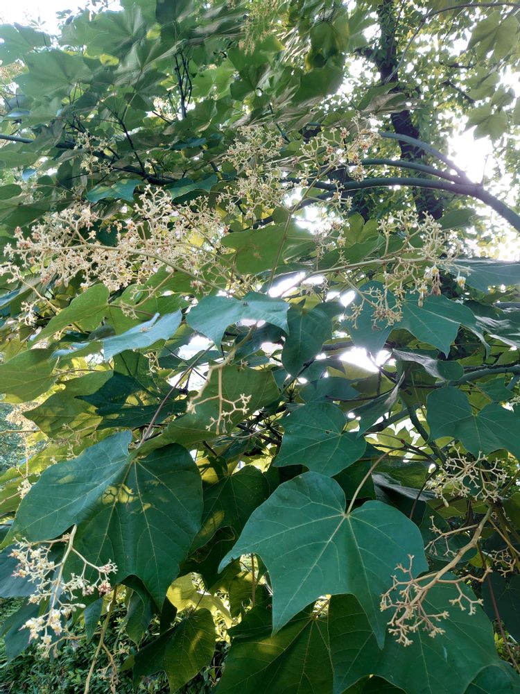 1️⃣アオギリ🌿何の木かしら?🌳桐は花札🎴でしか知らないけど😅お花は紫よね?💜白っぽいお花が散り始めた今月頭に検索🔍️してみました〜🌳アオギリ、なるほど🌿納得💚😊