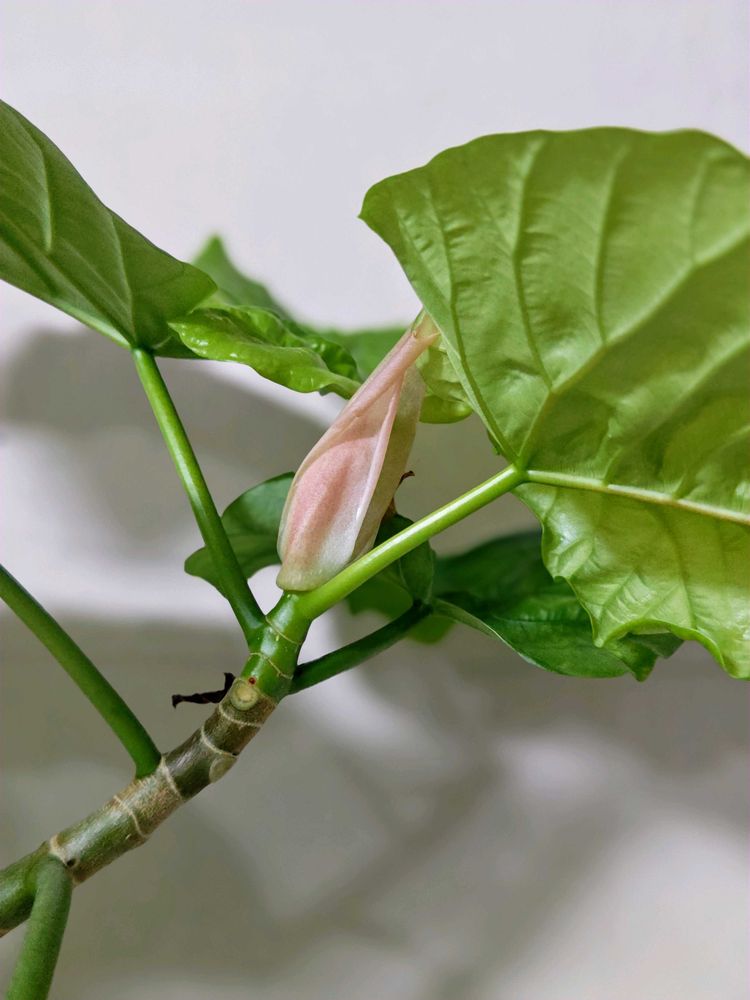 ウンベラータの新芽が、蕾のように見えます。天井近くまで伸びたてっぺん、曲げ木に挑戦しても遠い。