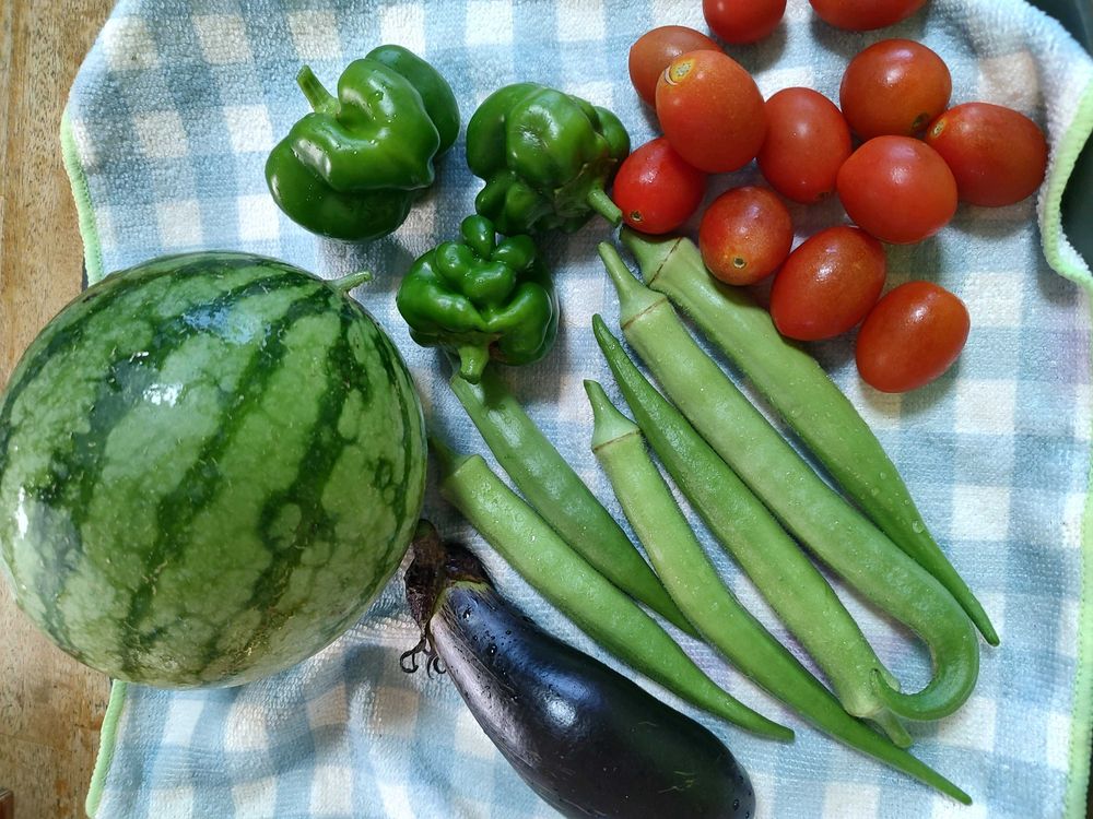 オクラとミニトマトはまだまだたくさん採れそうです☺️ 家庭菜園担当は主人で、私は食べる専門です😁