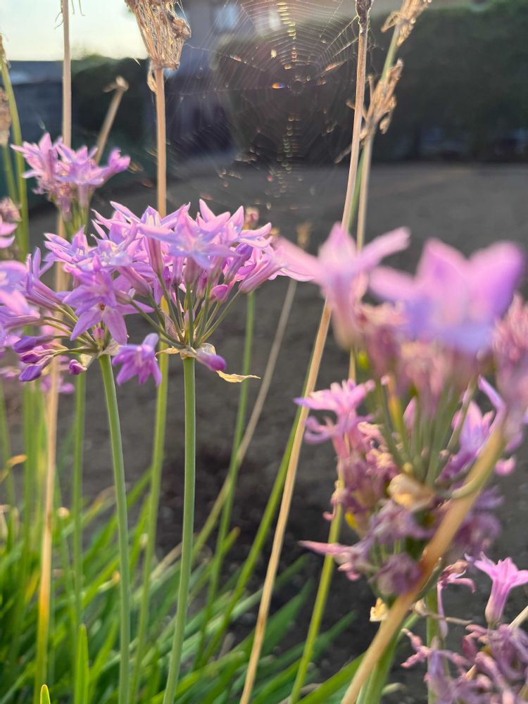 今朝 小さな畑に植えられているツルバキア、撮ってみたら蜘蛛の巣が