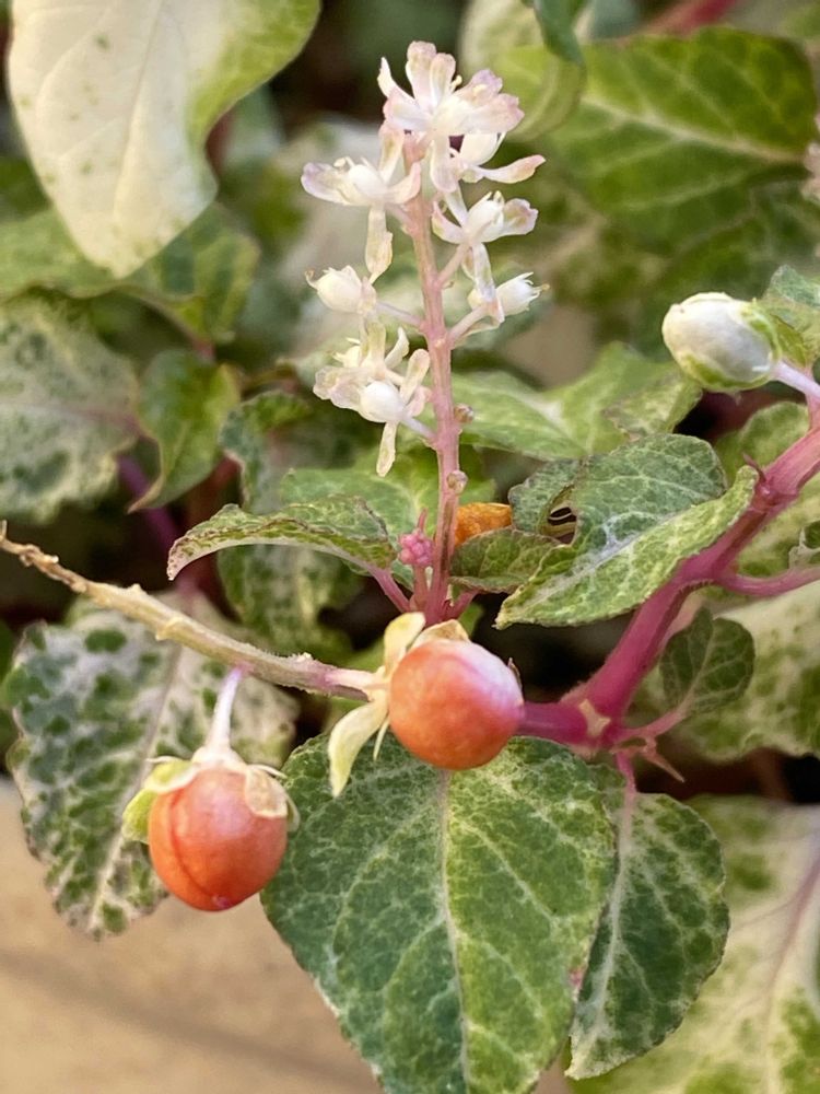 斑入りジュズサンゴの実が少しずつ赤味を帯びてきました。