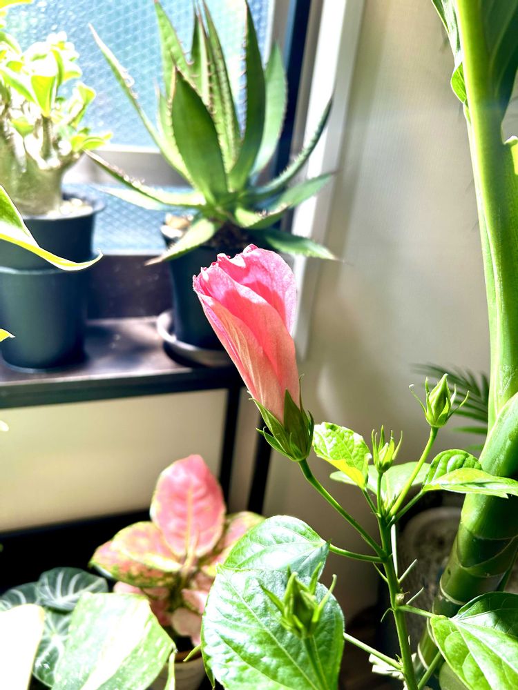 今日のハイビスカス🌺インドアハイビスカスサニーシティ🌺夕方には咲くかな😊紅一点😊